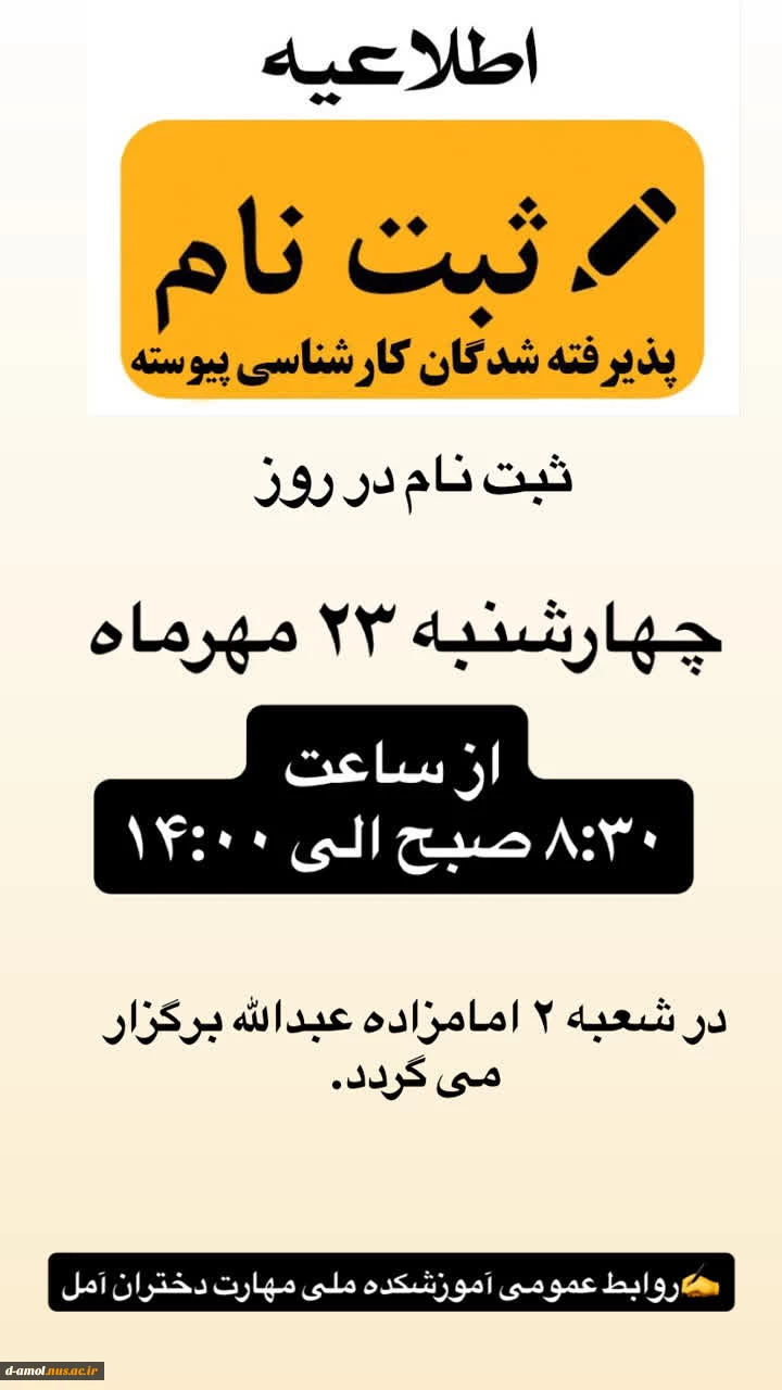 امتیاز دهید : زمان ثبت نام و مدارک لازم دانشجویان جدیدالورد کارشناسی پیوسته آموزشکده ملی مهارت دختران آمل 2 یکشنبه 20 مهر 1404 ساعت 10:50